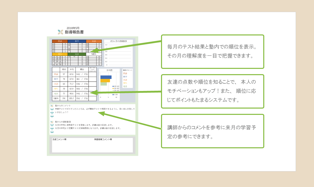 ご家庭への毎月の伝達事項を記載するとともに、生徒にとっては自分のテストの順位が勉強への意欲につながっています。