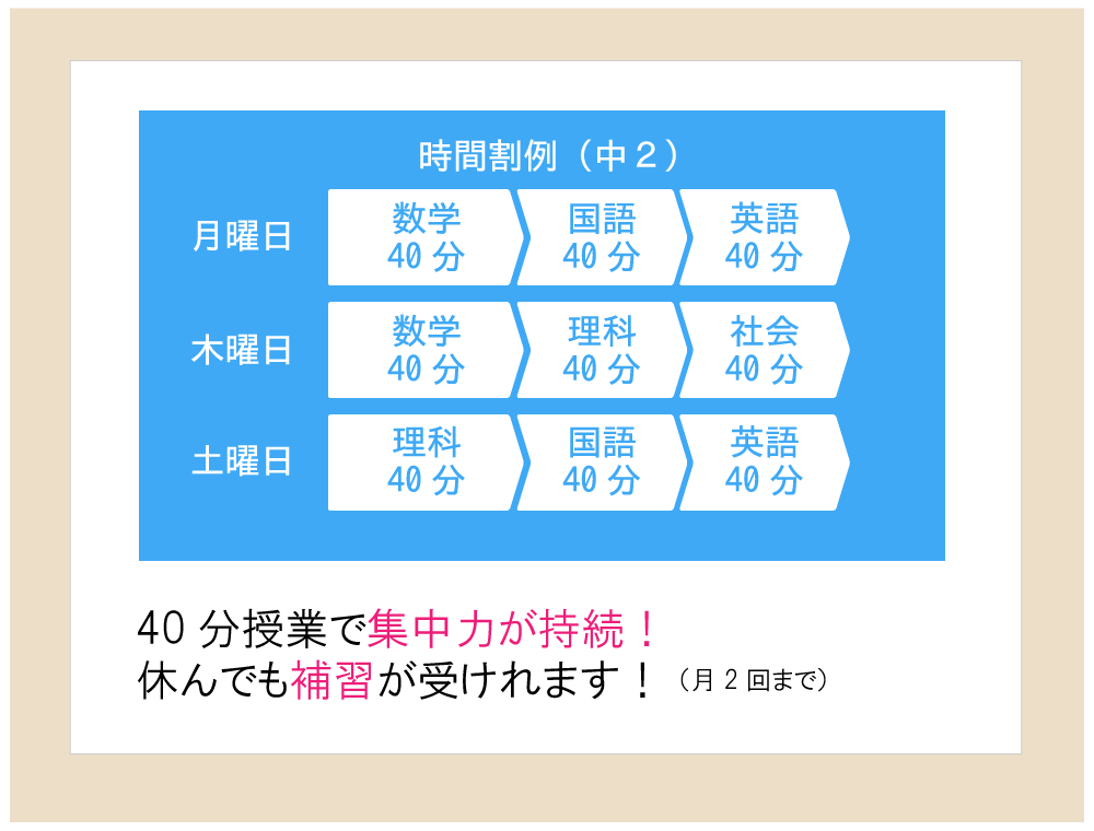 大人でも最大集中時間は約30分といわれています。チモロスクールでは勉強しているように見えるが集中できていない、いわゆる『机に向かって』いるだけの時間を極力なくすため、40分ごとに教科を変えて指導しています。